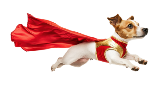 Jack russell terrier dog wearing a red cape flying isolated on transparent background