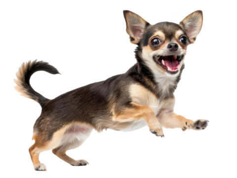 Energetic and adorable small-sized Chihuahua dog with a smooth, short black and tan coat, playfully leaping forward with an open mouth and excited expression,, isolated on transparent background.