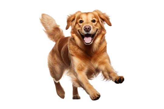 Golden retriever dog running and jumping happily on transparent background, isolated PNG image of playful golden retriever in mid-air, ideal for pet-themed designs, joyful canine actions, and dynamic