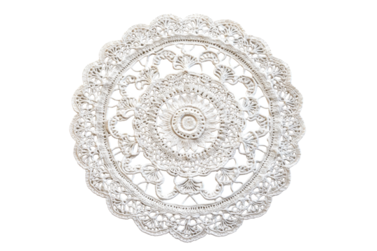 A delicate lace doily with intricate designs, isolated on transparent background
