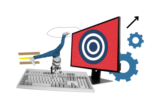 Art sketch collage of anonym girl do handstand wireless keypad tool workplace gearwheel optimization target software success
