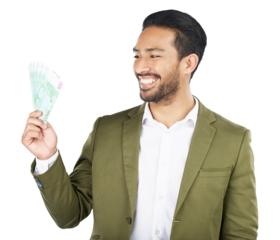 Happy asian man, money fan and finance in savings, investment or loan isolated on a transparent PNG background. Face of excited businessman smile for cash, dollar bills or profit in financial freedom