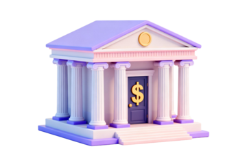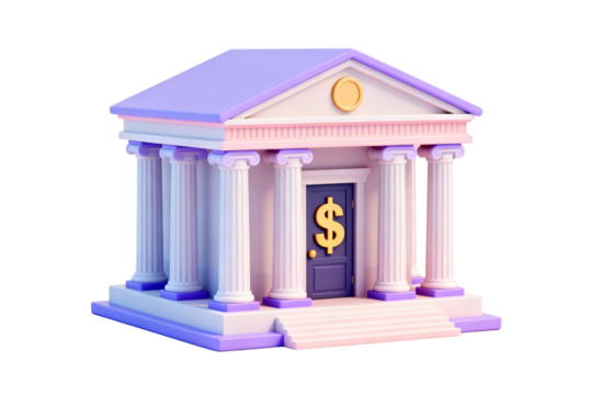 3D Blue bank building with white columns and a gold dollar sign, symbolizing financial institutions
