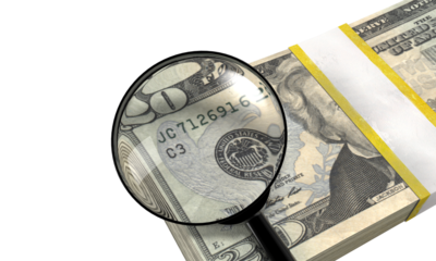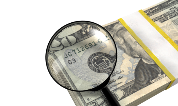 Magnifying glass inspecting the serial number on a stack of twenty us dollar bills on a transparent background.