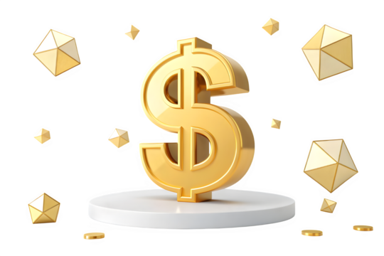 A golden dollar sign on a white podium surrounded by floating geometric shapes isolated on transparent background