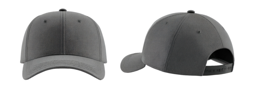 Two-view studio product shot of a gray, adjustable baseball cap. Isolated against a black background