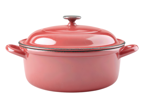 Round enamel Dutch oven with domed lid and loop handles, satin finish and clean base ring, isolated on transparent background.