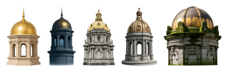 Architectural dome set including ornate, simple, gold, and weathered designs isolated. Grand building and historical design elements.