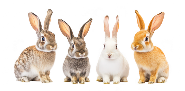 A group of four adorable rabbits of various breeds and colors. posing together on a clean white background. their unique features and playful nature. ideal for animal-themed projects