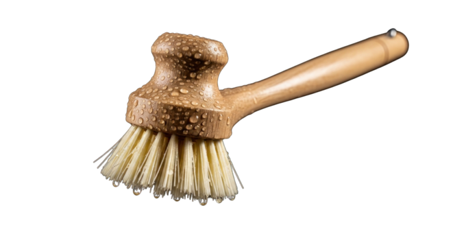 Close-up of wet bamboo dish brush with water droplets against a black background