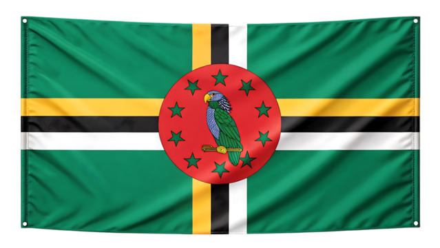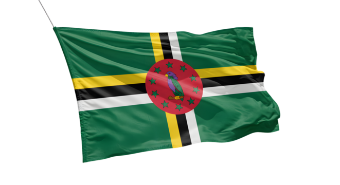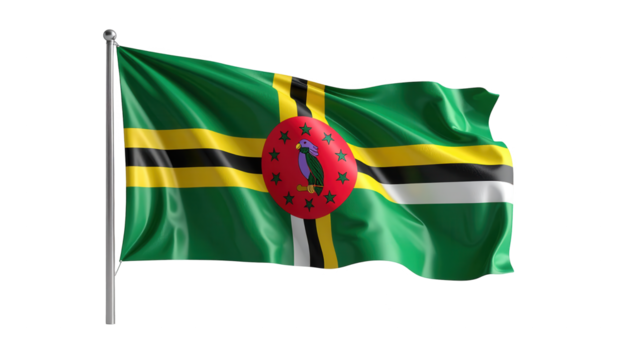 A detailed rendering of the national flag of Dominica, showcasing vibrant colors and flowing fabric against a black background.