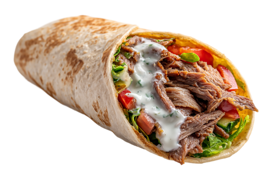 A savory shawarma wrap filled with grilled meat and fresh vegetables isolated on transparent background