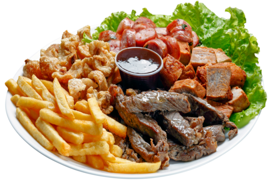 Snacks with fries, crackers, meat, pork, sausage and babercue sauce