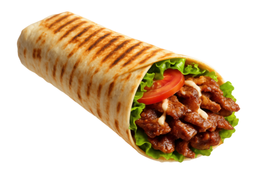 Grilled doner kebab wrap filled with sliced meat, lettuce, tomato, and sauce, captured isolated on white transparent background. Traditional Arabic food