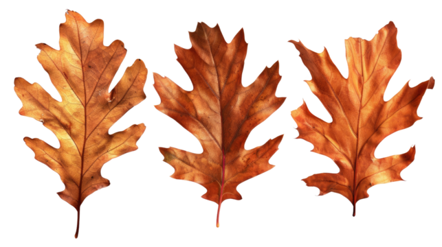 Three autumn oak leaves in shades of brown and orange in isolated on transparent background