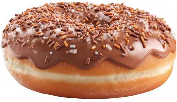 Chocolate glazed donut with sprinkles isolated on white / transparent background.