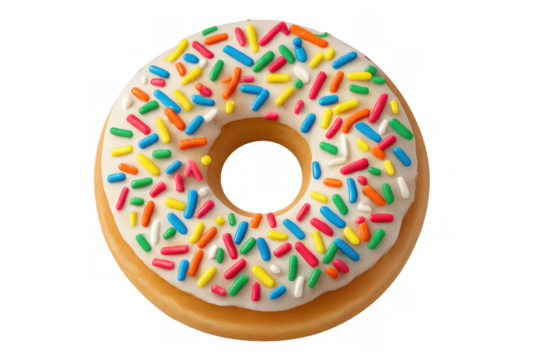Tasty donut with white icing and colorful sprinkles isolated on transparent background, perfect for food and dessert projects