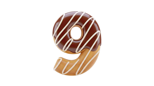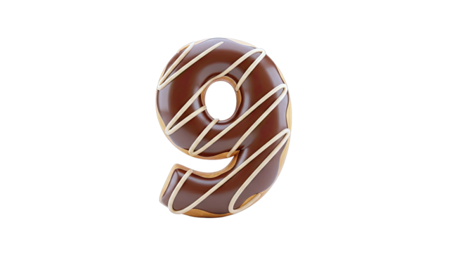 Donut shaped like the number 9 with chocolate glaze and cream drizzle