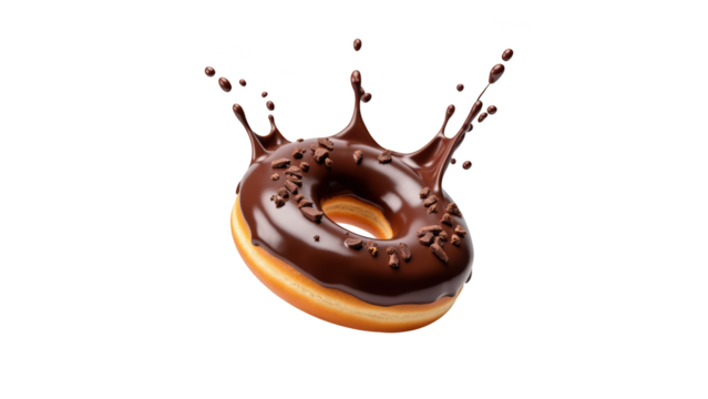 Delicious chocolate donut with splash of chocolate syrup, showcasing tempting dessert experience