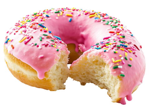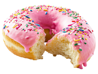 baked donut with pink frosting and colorful sprinkles isolated on transparent background