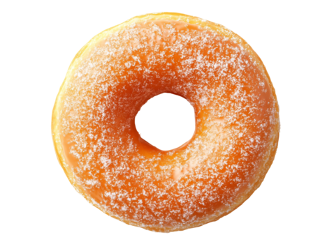 Closeup view of a caramel glazed donut with chocolate drizzle, isolated on white transparent background.