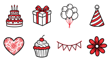 Birthday celebration set including cake, gift, balloons, party hat, heart, cupcake, bunting, and flower isolated. Hand drawn red and black doodle collection.