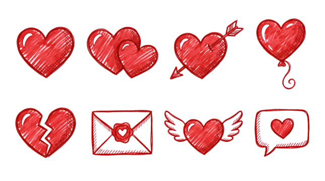 Red hand drawn heart set including broken, arrow, pulse, and chat bubble variants. Romantic love and valentine symbol collection.