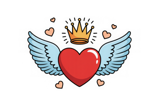 Vector romantic love sticker. Winged heart with a crown. King or queen of my heart concept. Cute cartoon doodle style. Flat illustration for valentine's day, patch or print.