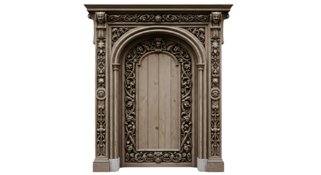 Ornate carved wooden door with elaborate baroque decorative frame and archway