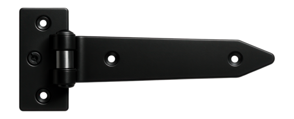Rustic bronze T-strap door hinge with a decorative design on a transparent background