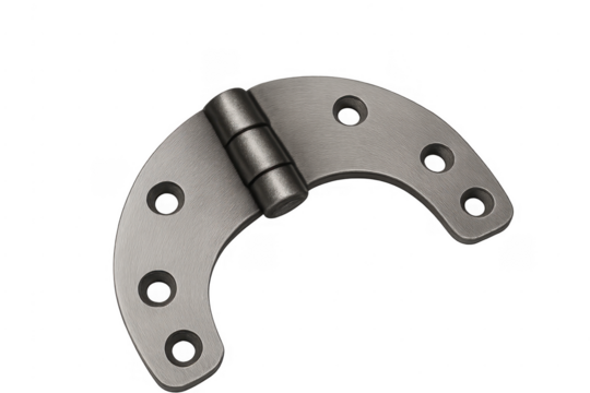Polished stainless steel door hinge with six screw holes isolated on transparent background