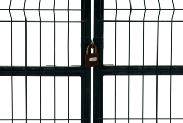 A metal prison cell door with bars isolated on transparent background. A metal door with bars and a lock is shown. The bars are rusted and the lock is also rusted.