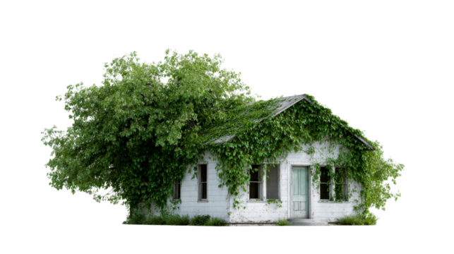 An old dilapidated house with white siding is completely overgrown with lush green ivy and a large leafy tree, offering a poignant visual for themes of nature reclaiming structures and