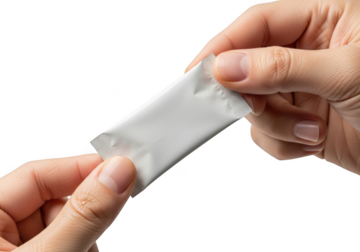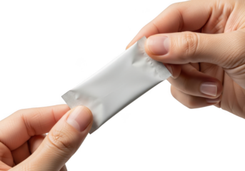 Closeup of hands opening a small, sealed white foil sachet or packet against a bright transparent background