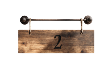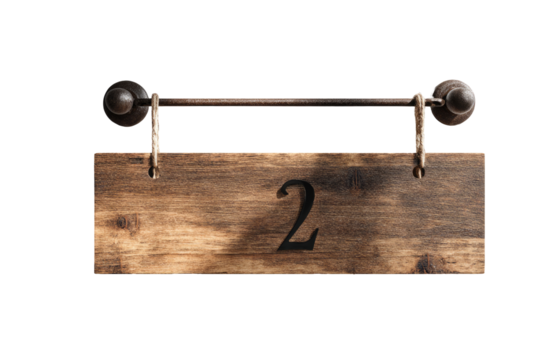 A rustic wooden sign, horizontally oriented, displaying the number two.  Dark-brown wood grain, with a simple, dark number.  Attached by dark metal hardware