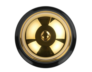 A golden doorbell with a glossy black surround, centered on a dark background