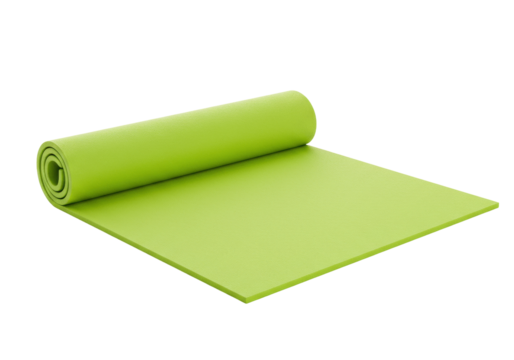 Green yoga mat isolated PNG on transparent background, rolled exercise equipment for fitness and workout, studio or home gym