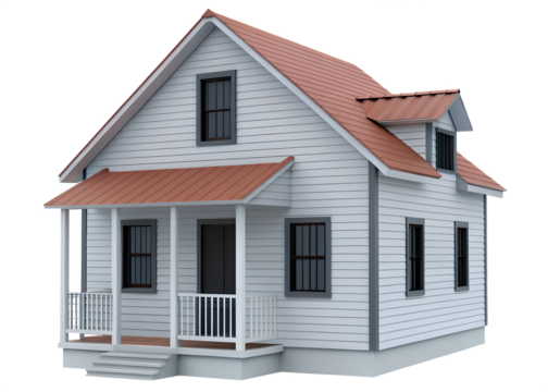 White cottage with porch, dormer window and red roof. 3d illustration transparent background