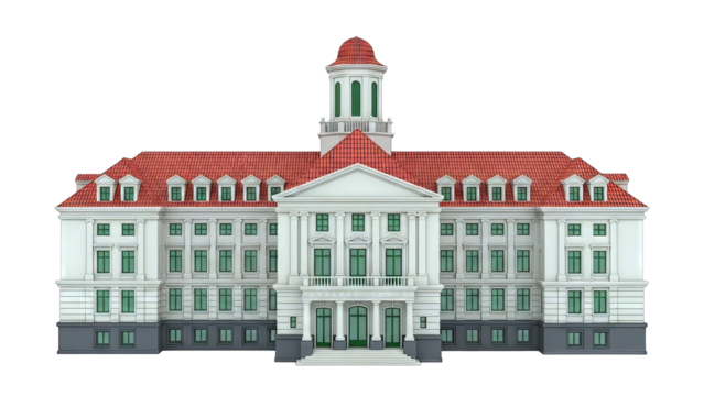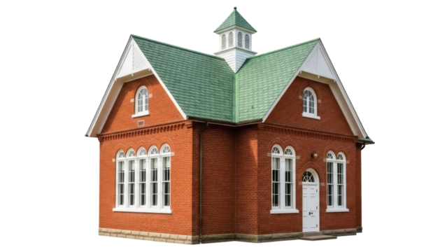 Isolated schoolhouse building made of brick with a green roof and a white cupola on top