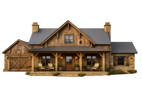 Illustration of a charming small wooden house with two windows and a round attic window, isolated on transparent background on transparent background