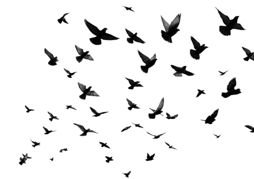 A dense flock of birds in flight against a black background.  Many small, dark shapes of birds fill the image,  appearing to move in a chaotic yet organized pattern