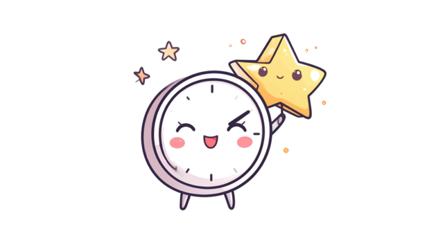 Adorable clock and smiling star cartoon on black background, sparkling with dots