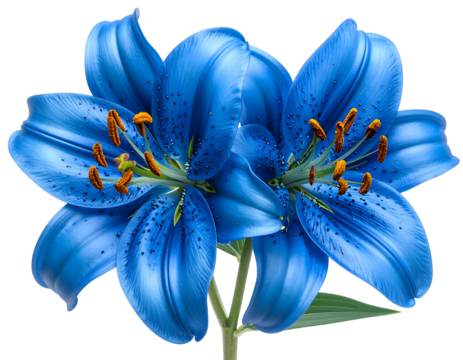 Two vibrant, velvety blue lilies, speckled with dark pollen, bloom majestically