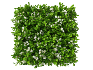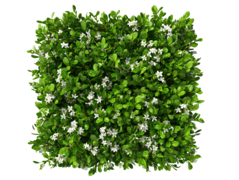 Square top-down shot of vibrant green foliage dotted with small white flowering plants