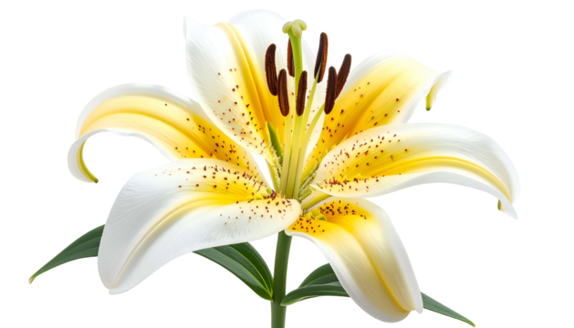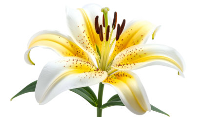 Delicate pink lily flower with speckled petals and yellow stamens isolated on a transparent background