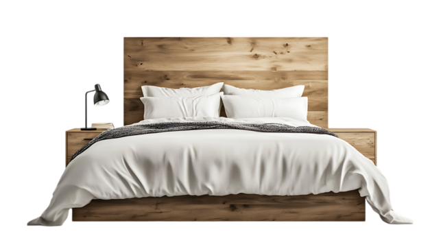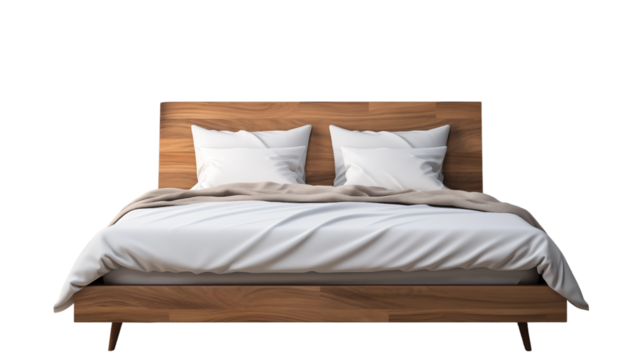 Sleek and modern wood double bed with headboard, offering both style and comfort for a sophisticated bedroom atmosphere, isolated on transparent background.