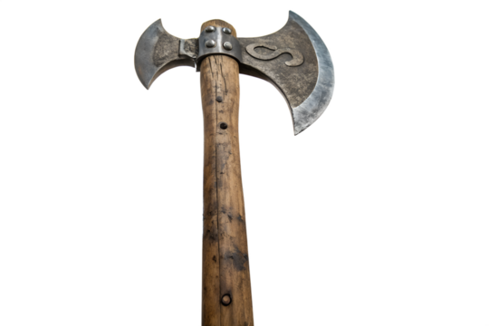 Ornate double battle axe with engraved silver crescent blades and wooden wrapped handle, isolated on a transparent background