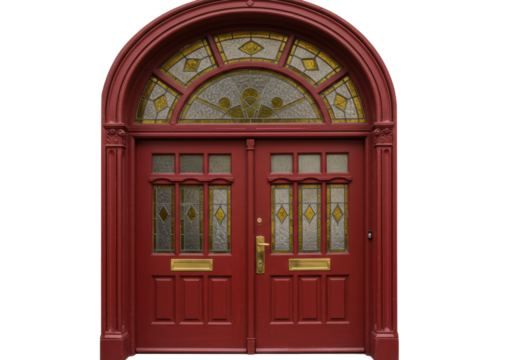 Elegant red arched double door with stained glass isolated, architectural detail of a classic entrance on no background