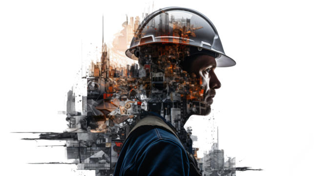 Construction engineer in double exposure above city and construction site isolated on transparent background