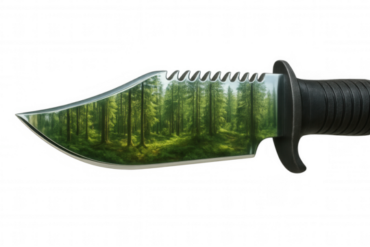 Combat knife blade reflecting a lush green forest, blending nature and survival elements on transparent background